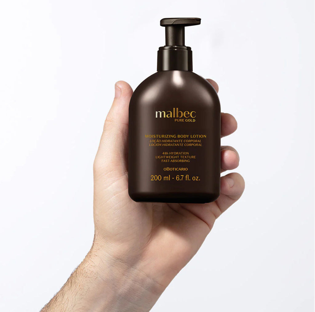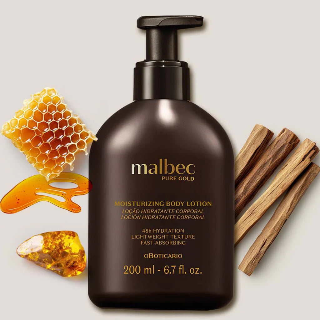 A Loção Hidratante Corporal Malbec Pure Gold tem uma fragrância inspirada no mel, com a composição luxuosa do âmbar e das madeiras, além de uma textura leve de rápida absorção, garantindo uma pele perfumada e hidratada por até 48h, sem deixar resíduos brancos.