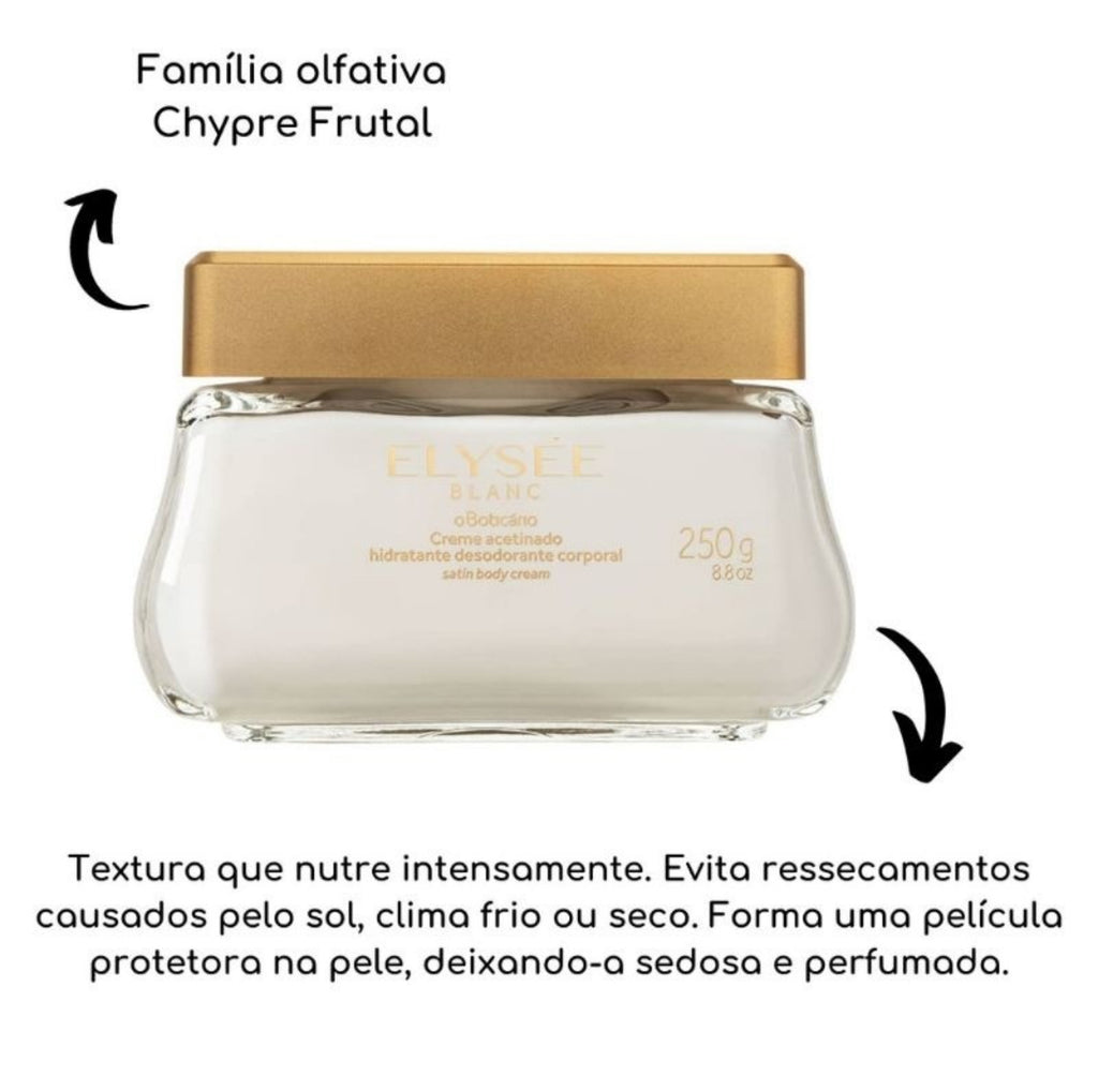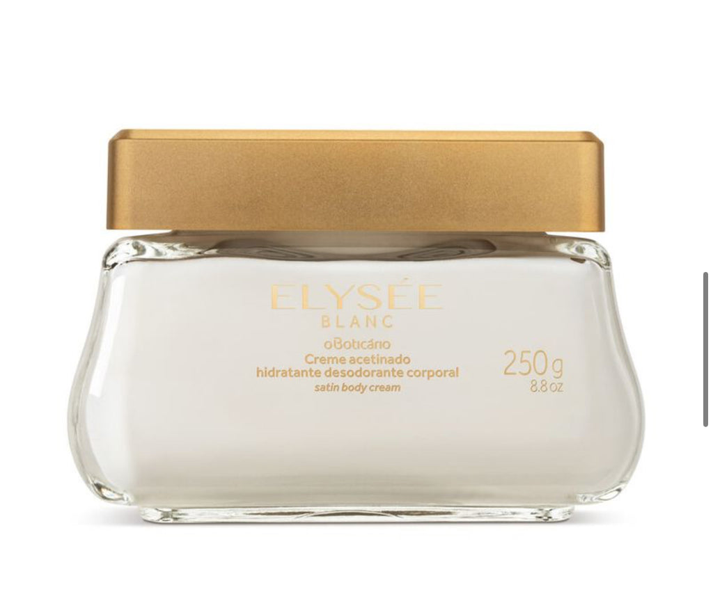 Elysée Blanc Satin Moisturizing Cream has a unique creamy texture with the striking and feminine fragrance of Elysée Blanc Eau de Parfum. With high moisturizing power , the satin cream forms a protective film on the skin , leaving a soft and silky touch that prevents dehydration caused by sun or cold, dry weather.